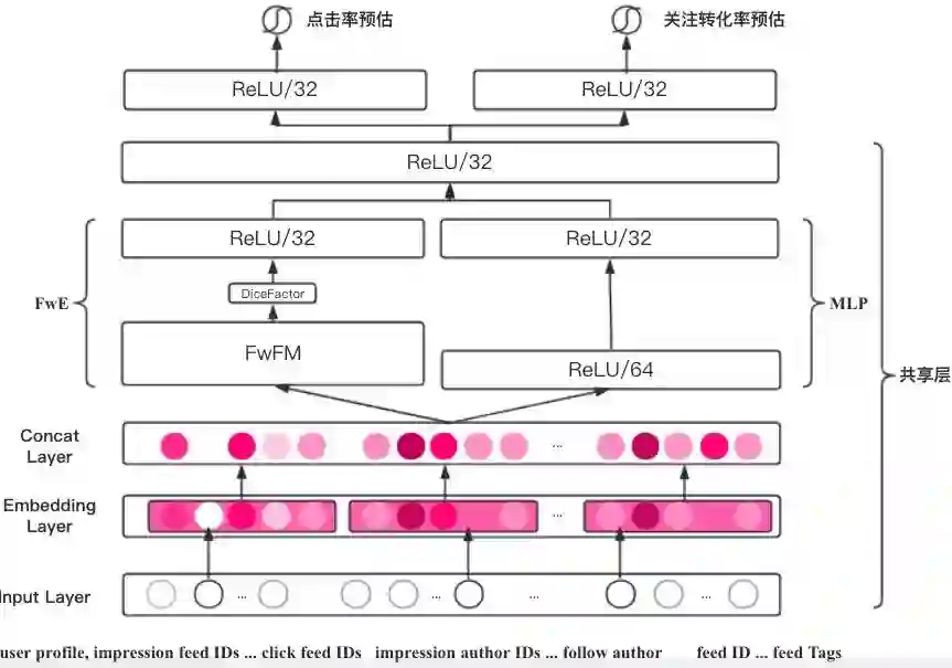 美图的推荐排序深度多目标模型演进之路主要是前期以Multi-task NFwFM为代表,后期辅以各种策略优化方法。其前4个隐含层是共享的,在最后即将预估多个目标时通过全连接层进行拆分,各自学习对应任务的参数,从而专注地拟合各自任务。其中FwFM模块为Field-weighted Factorization Machines[5],是FFM的改进版,参数量小得多但性能却和FFM差不多,特别适合在工程上应用。在线上预估时,因为模型尺寸没有变化,推理效率和线上的点击率预估模型一致。由于美图的场景中是在点击率任务的基础上同时优化关注转化率,融合公式上体现为优先按照点击率排序再按照曝光—>关注的转化率排序。