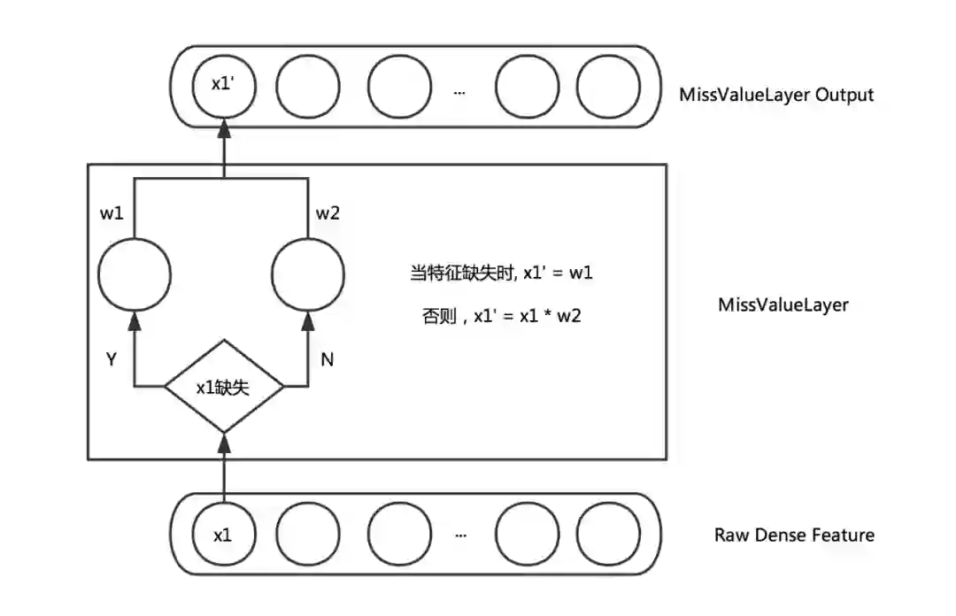 通常在训练样本中难以避免地有部分连续特征存在缺失值,更好地处理缺失值会对训练的收敛和最终效果都有一定帮助。设计了Miss Value Layer来自适应地学习缺失值的权重,其结构如下: