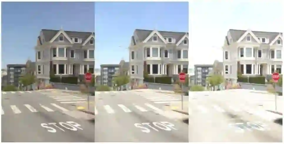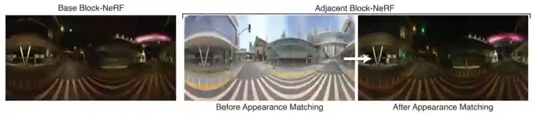 图 6. 当渲染基于多个 Block-NeRF 的场景时,该算法使用外观匹配来获得整个场景的一致样貌。给定一个 Block-NeRF(图左)的固定目标外观,算法会优化相邻 Block-NeRF 的外观以匹配。在此示例中,外观匹配了在 Block-NeRF 中产生一致的夜间外观。