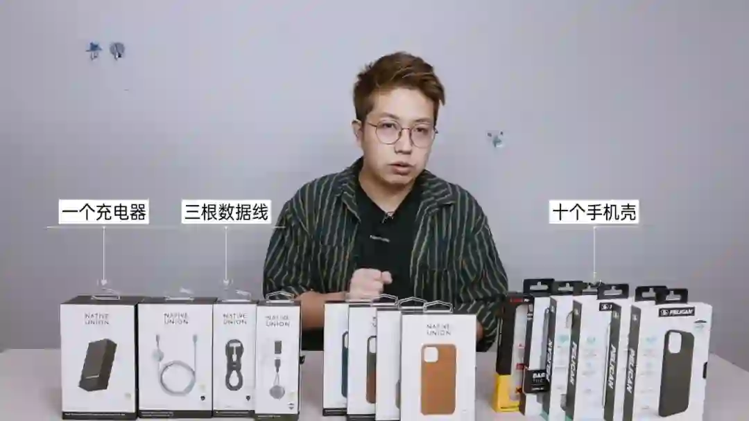 这一堆有14件产品,分别是一个充电器、三根数据线和10个手机壳,是的,上千块。
