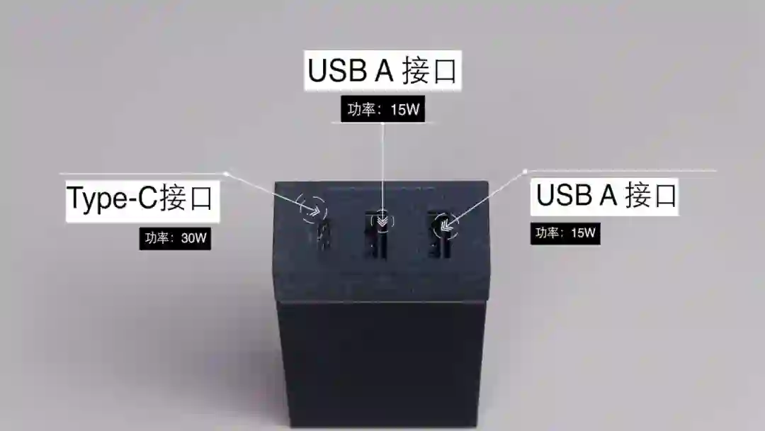 接口有三个,两个A口加一个C口,满足我多个设备同时充电需求,C口最高30W,A口最高15W。智能IC技术会自动判断接入的设备,调整充电速度,保证不同的设备都能有最大充电功率。