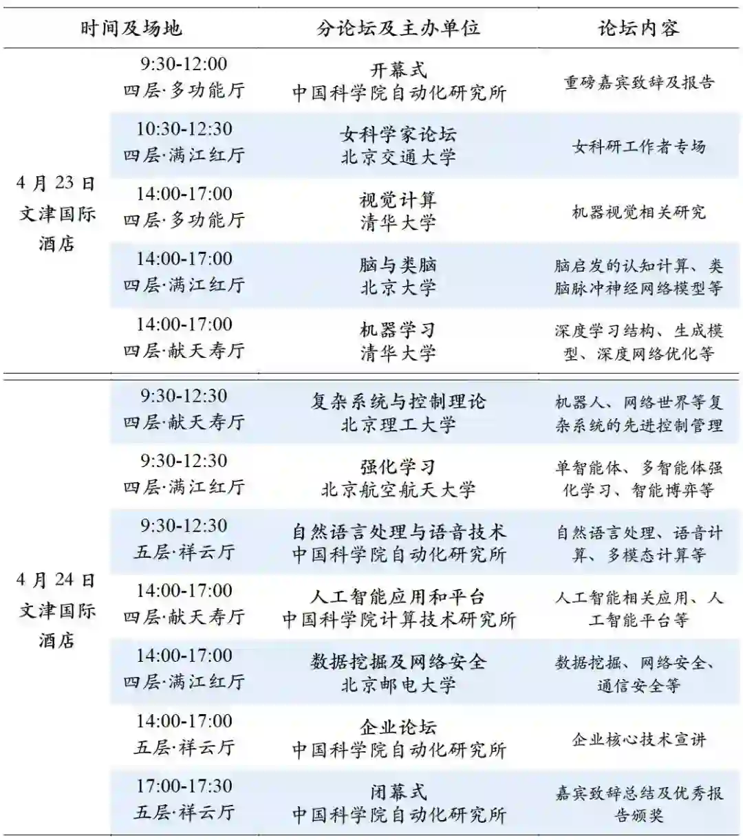 本届论坛将持续两天,分设女科学家论坛、视觉计算、脑与类脑、机器学习、复杂系统与控制理论、强化学习、自然语言处理与语音技术、人工智能应用和平台、数据挖掘及网络安全、企业论坛十个分论坛,涵盖人工智能各领域内容。20余名青年教师以及50余名学生将带来报告,内容包括近两年来顶刊顶会上发表的众多高质量工作。