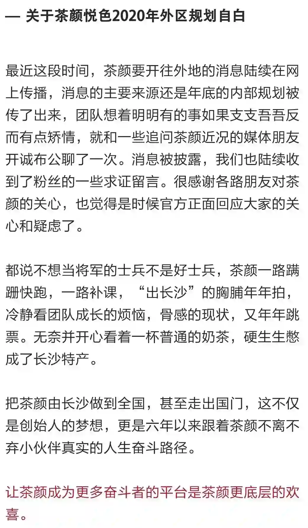 【茶颜悦色确定进军武汉市场】1月19日讯,网红茶饮“茶颜悦色”官方微博发声,针对近期公司年底规划被外泄的消息做出正式回应,茶颜悦色2020年将在长沙以外的地区开拓市场,但目前暂不考虑北上广地区。据多方消息证实,茶颜悦色下一步预计将相继进军武汉、常德市场。此外,茶颜悦色称仍然会采用直营模式,不加盟,不做代理。并称,鉴于自身能力问题,没有将长沙外的首店选在北上广深,但是北上广深一定会来的。茶颜悦色是2013年在长沙创立的新式茶饮品牌,主打中国风。(中国饮品快报)