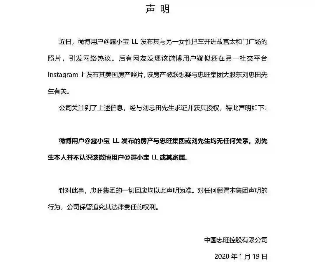 【忠旺回应“故宫奔驰女”事件:所涉房产与集团和大股东均无关系】日前,“故宫奔驰女”事件进一步发酵,有文章称该女曾晒出的位于美国洛杉矶的海景豪宅房主与忠旺集团创始人刘忠田前妻有所关联。19日,中国忠旺官微在微博上发表声明称,“微博用户@露小宝LL 发布的房产与忠旺集团或刘先生均无任何关系。刘先生本人并不认识该微博用户@露小宝LL 或其家属。”(微博)
