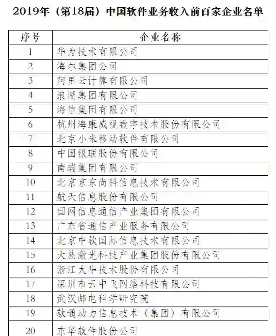 【2019年中国软件业务收入前百家企业名单出炉】19日讯,工信部发布2019年中国软件业务收入前百家企业发展报告,本届软件百家企业的软件业务收入保持增长态势,2018全年共完成软件业务收入8212亿元,比上届增长6.5%,占全行业收入比重为13.3%。华为、海尔集团、阿里云分别位列第一、第二、第三名。此外,浪潮集团、海信集团、海康威视、北京小米移动软件有限公司等进入前10名单。(《科创板日报》)