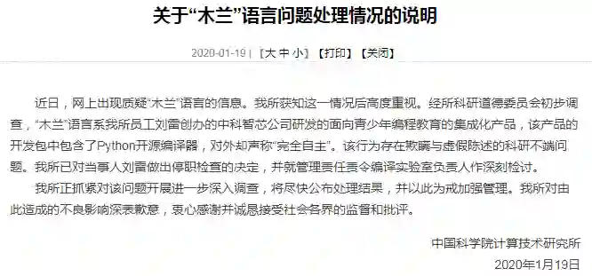 【中科院计算所回应木兰造假:刘雷欺瞒与虚假陈述已停职】19日讯,针对网上热议自主研发“木兰”语言套壳Python一事,中科院计算机所回应称,当事人刘雷号称“完全自主研发”行为存在欺瞒与虚假陈述的科研不端问题,已停职检查。(财联社)