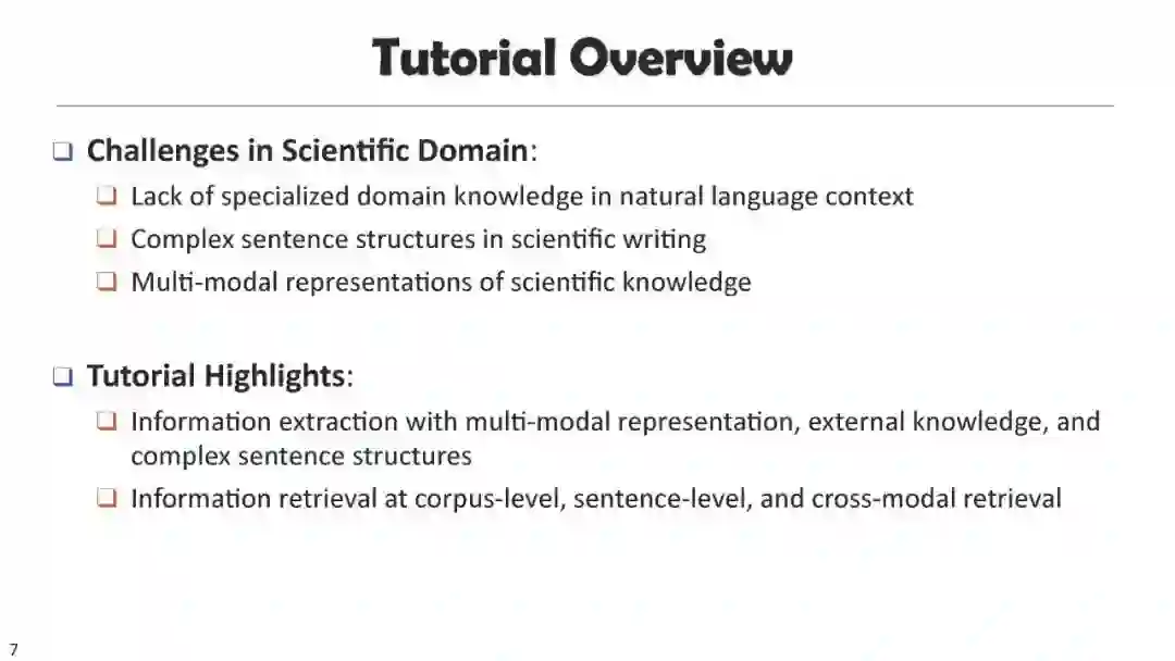 本教程针对对科学网络挖掘的自然语言处理(NLP)技术感兴趣的研究人员和从业人员。探索网络上大量快速增长的科学文献对科学发现非常有益。然而,由于缺乏自然语言环境下的专业领域知识、科学写作中复杂的句子结构以及科学知识的多模态表示,科学网络挖掘尤其具有挑战性。