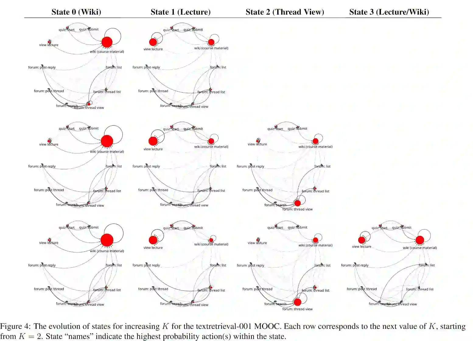 1、隐状态的效果展示:点的大小是单个行为的Pagerank值,反映出这种行为模式的主要行为,边的粗细是转移概率,反映这种模式下行为之间的关系。作者对比了不同隐状态的点和边,以及不同课程的相似的隐状态。