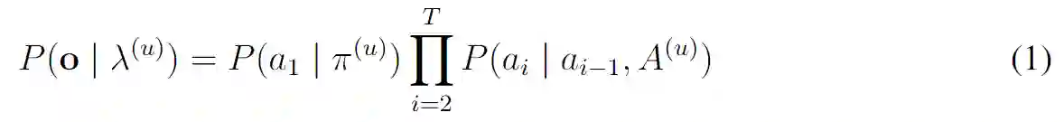 1、HMM的思路:最简单、直接的想法是,把行为看成是可观察的output,隐状态是行为模式,那么隐状态是行为的概率分布,会缺失行为之间的转移关系。因此,这里的2L-HMM加入了行为之间的依赖关系,在隐状态表示行为模式的基础上,通过将一个session看成是一个output,对这个session再用Markov Model学一个转移概率矩阵。