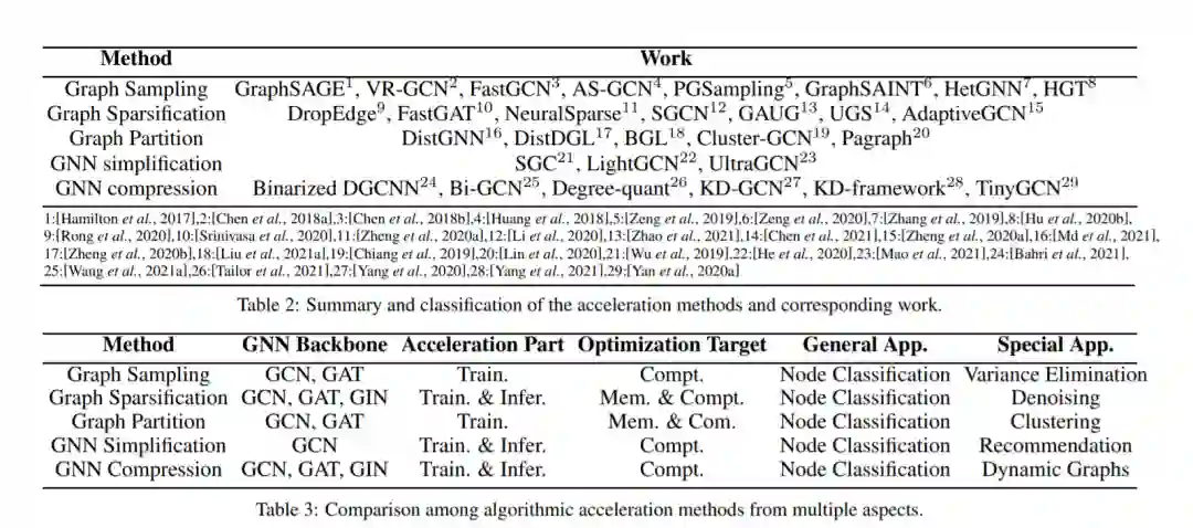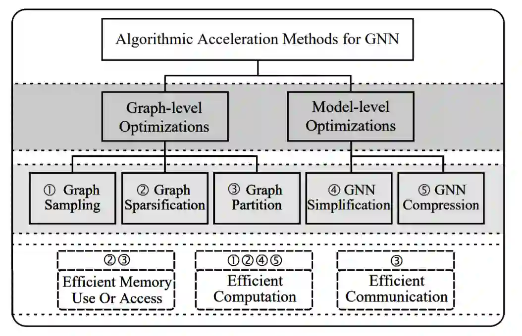然而,目前还没有文献从算法层面系统地研究GNN的加速方法。实际上,算法级别的改进不仅提高了模型的精度,而且加速了模型的学习[Chen et al., 2018b; Bojchevski et al., 2020]。我们认为,GNN的算法加速方法将大大有利于训练和推理过程,同时,GNN框架的整体性能[Fey and Lenssen, 2019; Wang et al., 2019a],因为一个设计良好的框架加上一个优化的算法可以从经验上获得双重提升[Lin et al., 2020]。因此,尽管有一些关于图相关框架和硬件加速器的有见地的综述,但对GNN算法加速方法的全面综述是非常值得期待的,这正是本工作的目标和重点。