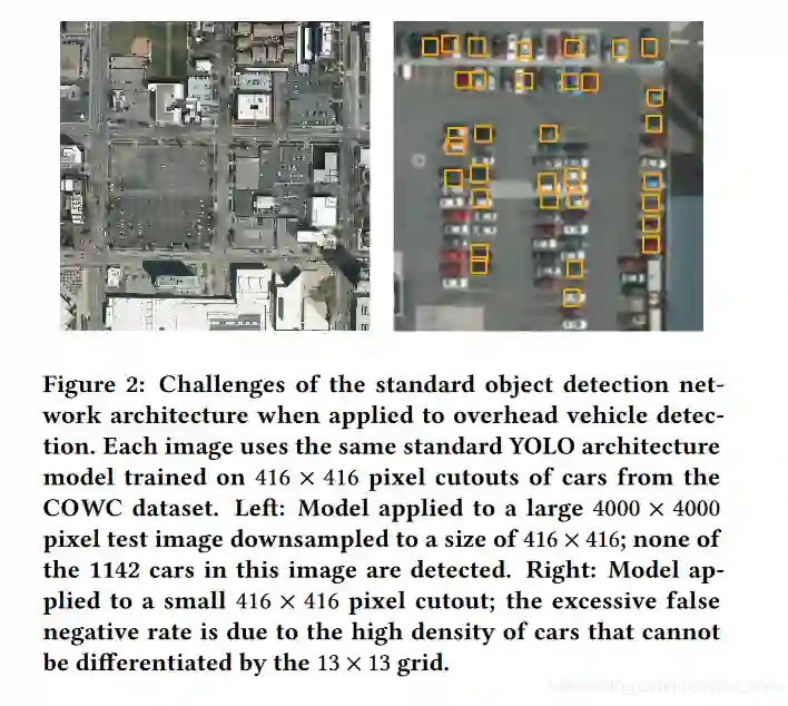 下面的Figure2展示了使用两种不同类型的图像作为输入时模型(原始的YOLOv2)的预测结果对比,左边是直接把卫星图像原图resize到