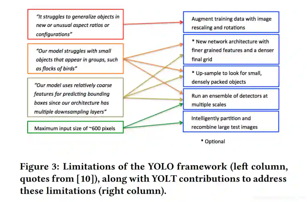 下面的Figure3详细展示了卫星图像目标检测的主要几个难点以及YOLT的解决方案,左边这一列代表难点,右边则代表YOLT提出的方法。