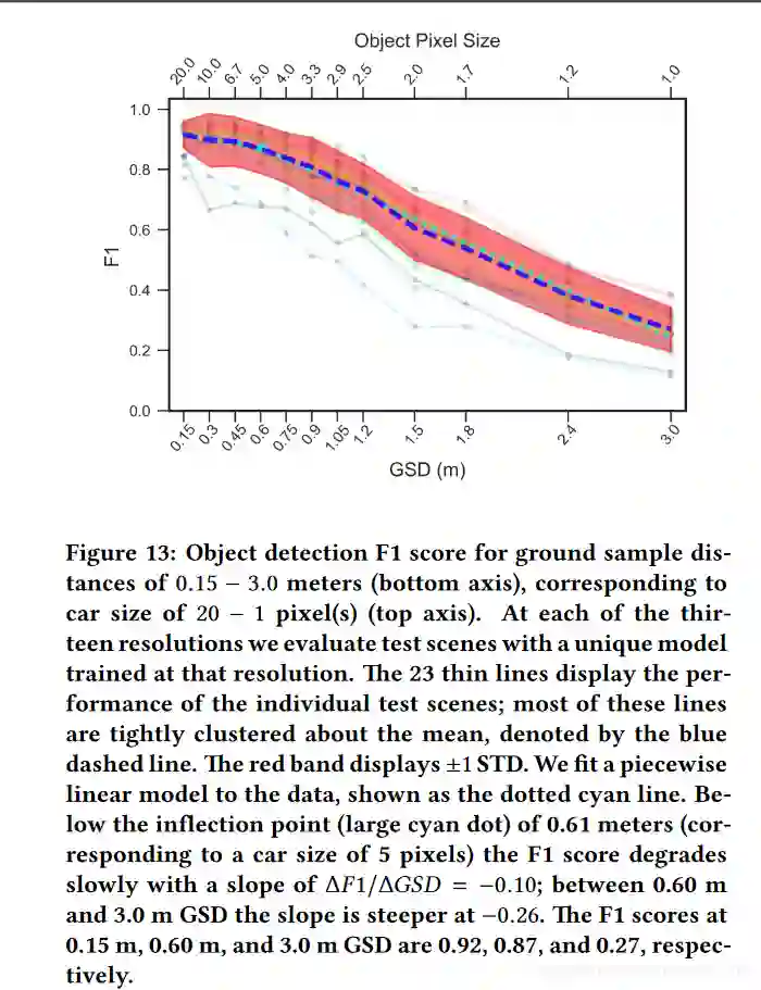 然后Figure13将不同分辨率输入下检测模型的F1值进行了图表量化,其中横坐标代表目标的像素尺寸。可以看到,随着分辨率的降低,图像中目标的像素尺寸也越来越小,检测效果(F1值)也越来越低。