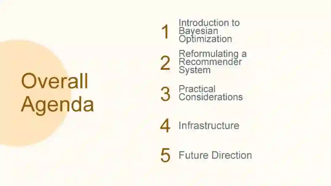 在本教程中,我们将讨论如何应用贝叶斯优化技术为这样复杂的在线系统获取参数,以平衡竞争性指标。首先,我们将深入介绍贝叶斯优化,包括一些基础知识以及该领域的最新进展。其次,我们将讨论如何将一个真实世界的推荐系统问题制定为一个可以通过贝叶斯优化解决的黑盒优化问题。我们将专注于一些关键问题,如新闻推送排名、人员推荐、工作推荐等。第三,我们将讨论解决方案的架构,以及我们如何能够为大规模系统部署它。最后,我们将讨论该领域的扩展和一些未来的发展方向。