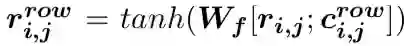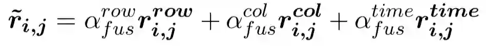 (2) 第二层:我们采用了一个融合门机制将三元组来自行、列和时间维度的信息进行融合。首先通过多层感知器得到三元组来自行、列和时间维度的总体表示。然后通过对比,计算针对这个三元组,它的行、列以及时间维度表示的重要性,最后通过加权求和得到最终的三元组表示。用新得到的