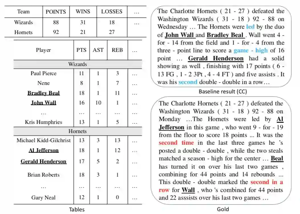 图1 ROTOWIRE数据集中的一个例子。左侧为输入的球队/球员的统计数据,右上为基线模型生成的结果,右下为参考文本。