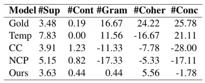 (2) 相比于另外两个基于神经网络的模型,我们的模型在语法(Gram),连贯性(Coher)和简明性(Conc)上表现更好。