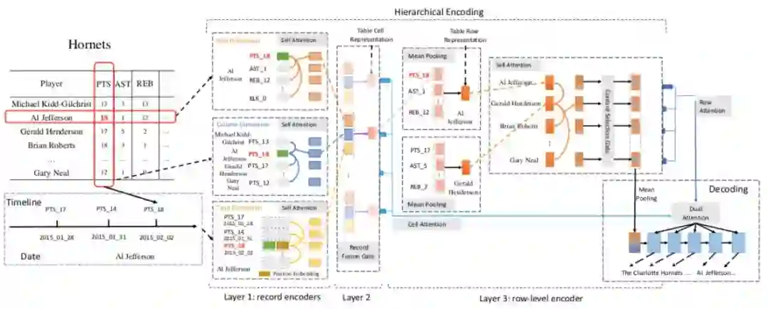 (3) 第三层:我们通过三元组表示的池化以及门机制[5],得到表格中每一行(球队/球员)的表示。