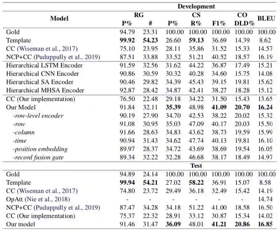 我们对比了我们的模型和基线模型(CC)、SOTA NCP+CC模型、基于模版生成的结果和参考文本生成的结果,发现: