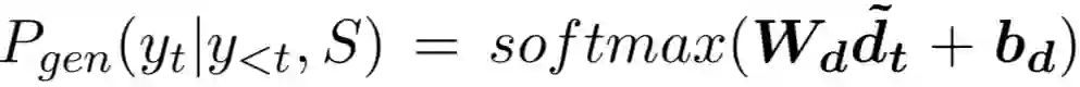 。条件拷贝机制将第t步生成各个词的概率分解成两个部分:从表格拷贝和从词表生成。其中