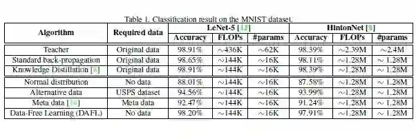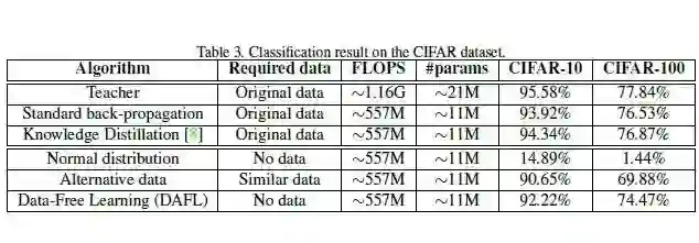 DAFL 比之前的最好算法在 MNIST 上提升了6个百分点,并且使用 resnet18 在 CIFAR-10 和 100 上分别达到了 92% 和 74% 的准确率 (无需训练数据)。第2篇谷歌的工作实现了进一步涨点,并且也适用于了 ImageNet 这一大数据集。