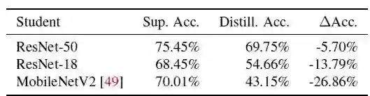 最后作者也比较了不同架构的学生网络的蒸馏结果,如下图16所示。使用的教师模型为 Resnet-34,其精度为75.45%。作者对所有的学生网络使用相同的生成器 。ResNet-50的性能最好,与有监督方式训练的模型相比,精度下降了5.70%。然而,ResNet-18 和MobileNetV2 上的性能结果要差得多,与有监督方式训练的模型有更大的差距。这表明,学生和教师结构之间可能存在一些纠缠,使得在 ResNet-50 上学习的生成器 MobileNetV2 和 ResNet-18 上的效率低于 ResNet-50 作为学生网络。如何提高其泛化能力仍是未来研究的课题。