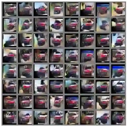 为什么在这个任务中会产生模式坍塌的问题?一种可能的解释是:生成器持续地产生一种图片,这种图片经过教师网络会输出一个很像 One-hot 编码的结果,这个结果就会导致 消失了,即使其他的损失函数还没有优化到最优值。下图10就是一个典型的模式坍塌的例子,生成器 生成了很多的自然图片,但是无一例外都是红色的车。