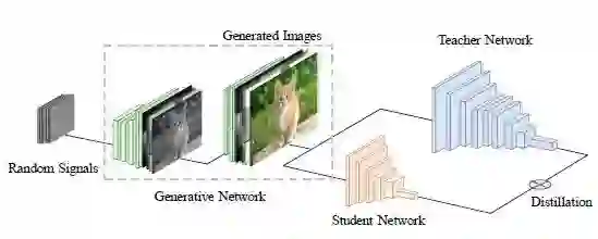 指训练数据的分布,这里的训练数据和 DAFL 一样后续通过 GAN 来生成。通过引入教师学生算法,作者解决了生成图片没有标签的问题,并且可以在待压缩网络结构未知的情况下对其进行压缩。
