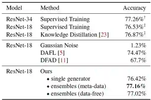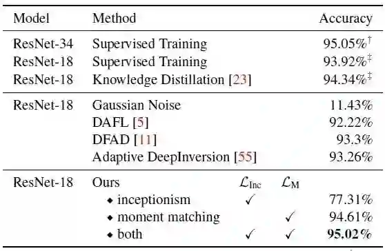 本质上和 DAFL 的两个阶段是一致的,都是先用生成器 输出的生成图片代替训练数据集进行训练,然后使用生成数据结合蒸馏算法得到压缩后的网络。本文方法通过 Inceptionism loss 和 Moment matching loss,以及训练多个生成器来解决 DAFL 无法在大数据集 ImageNet 上使用的问题。