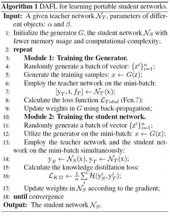 DAFL 的流程和算法如下图1和图2所示。把待压缩网络当做判别器 ,通过上式 12 作为损失函数来训练生成器 。通过生成器 来得到足够的生成图片,这些图片的分布与训练教师网络的训练数据是一致的。然后,再通过上式 1 的蒸馏损失和这些生成图片对教师网络进行蒸馏得到学生网络。