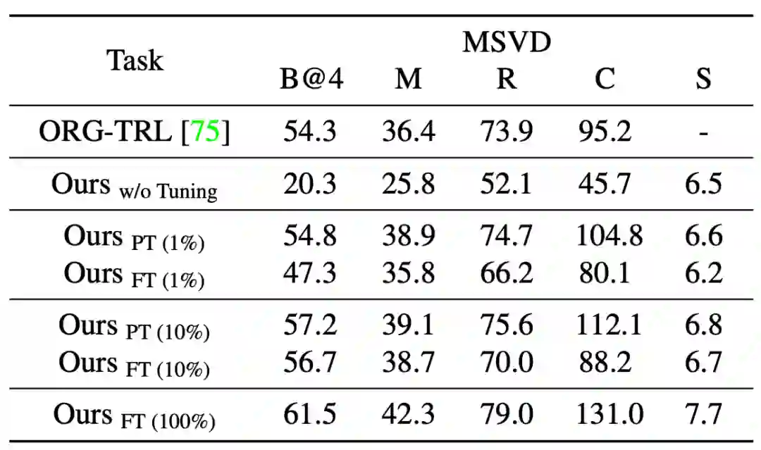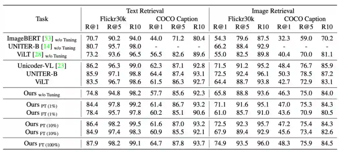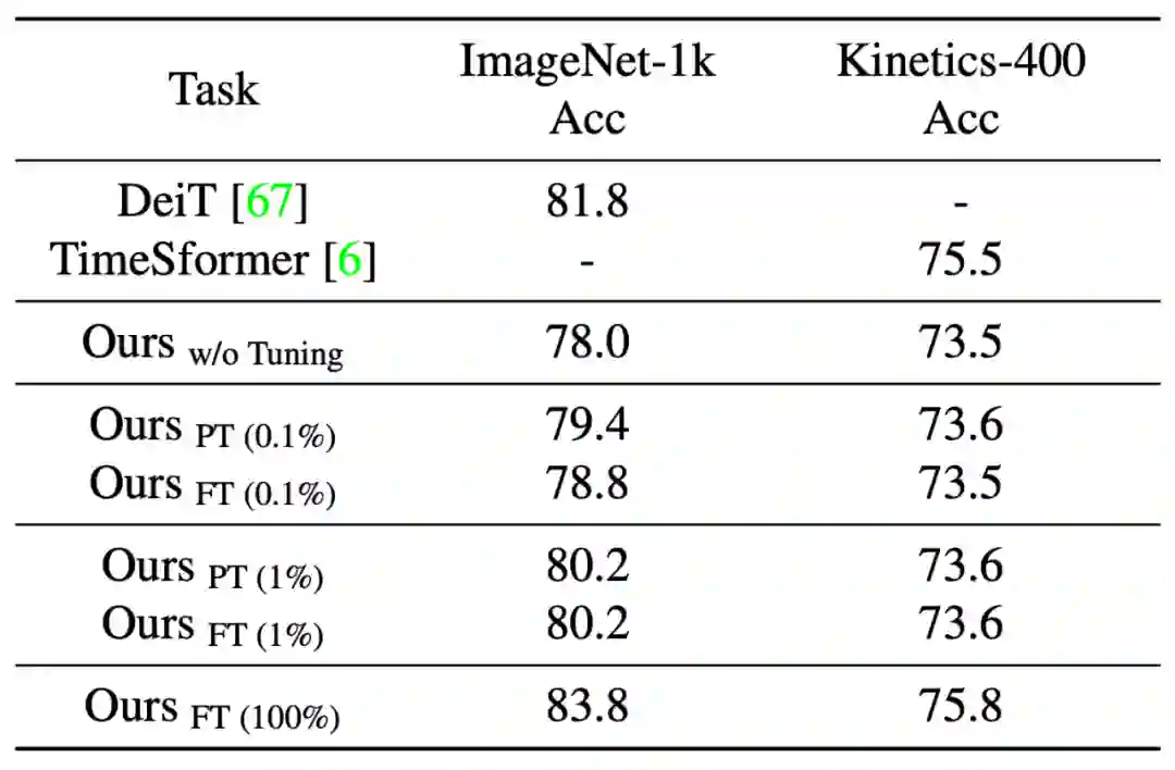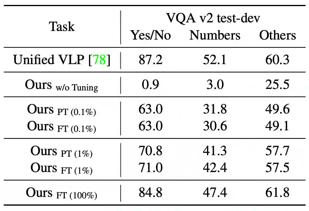 通过 1% 的数据对少量模型参数进行 Prompt Tuning,Uni-Perceiver 即可以接近 SOTA 的效果。
