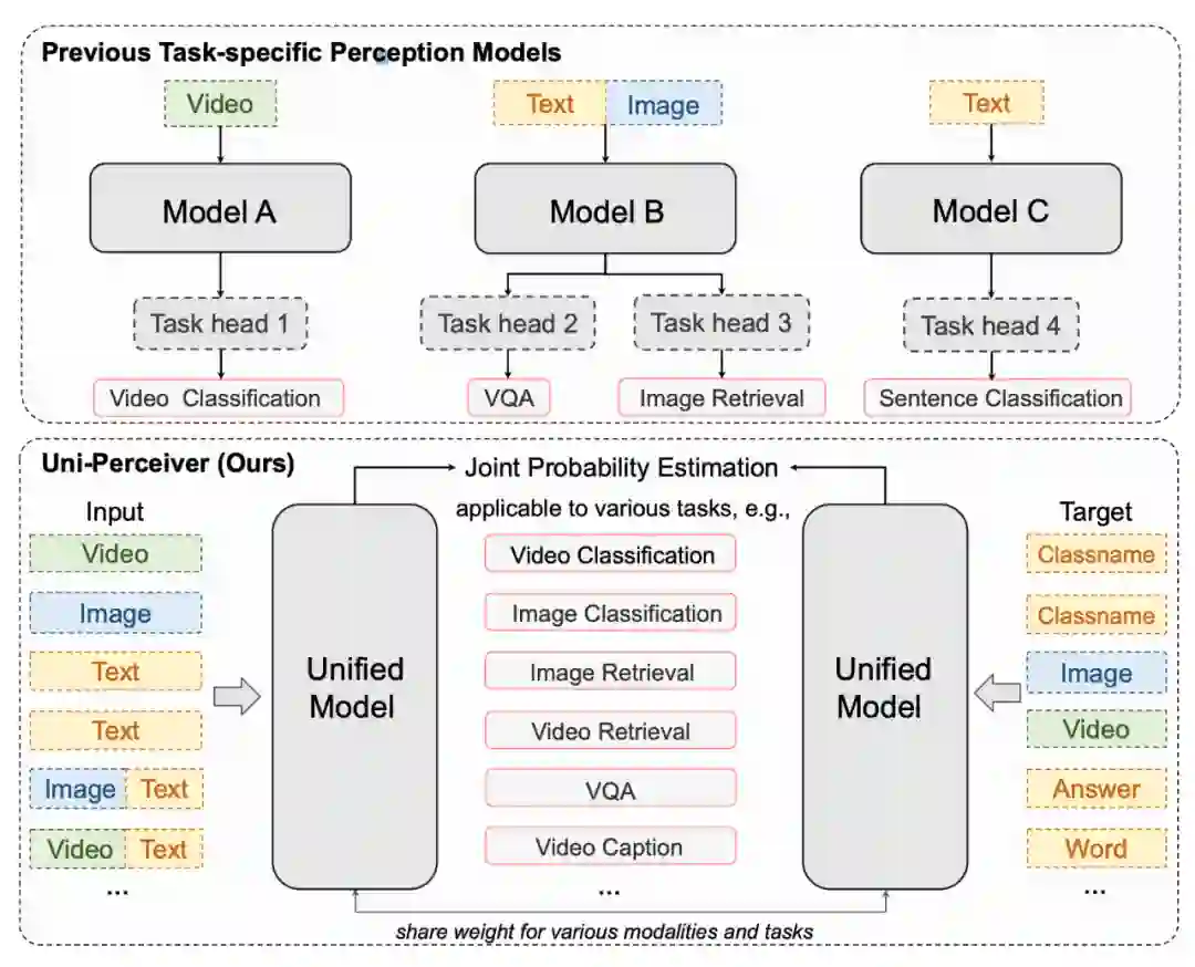 图 1 现有的特定于任务的感知模型和 Uni-Perceiver 的比较