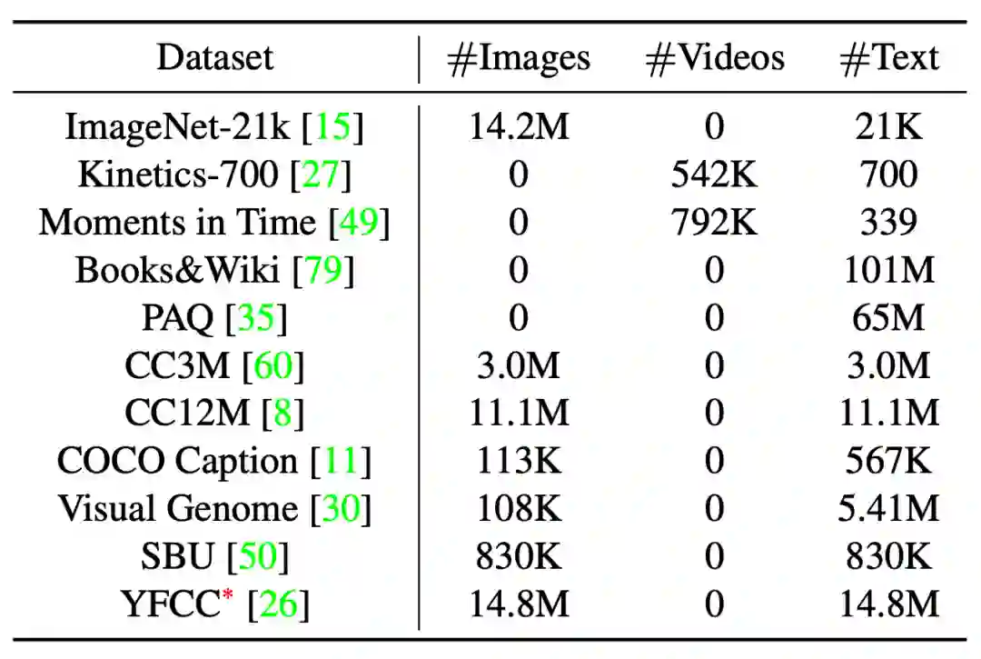 Uni-Perceiver 在表 1 所示的大规模单模态和多模态数据集上进行了训练。实验中,作者使用与 BERT-base 相同配置的 Transformer 编码器。在每次迭代中,每个 GPU 独立采样任务和数据集,并在梯度反向传播之后同步不同 GPU 之间的梯度。该模型在 128 个 Tesla V100 GPU 上以分布式方式进行了 50 万次迭代的预训练。