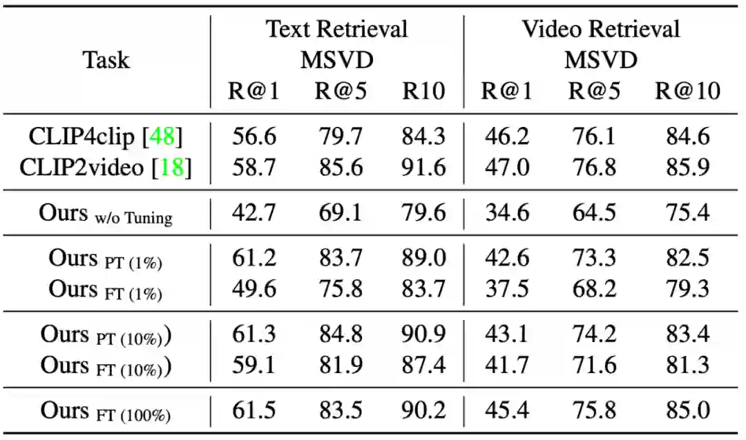 Fine-tuning:当下游任务数据量足够时,Uni-Perceiver 的预训练模型可以通过 fine-tuning 取得超过 SOTA 或与 SOTA 不相上下的结果。