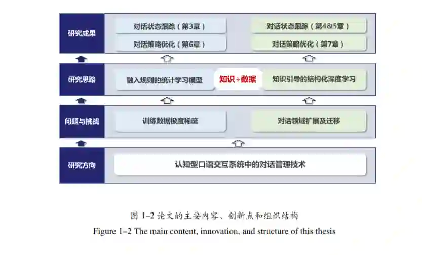 对话管理器是任务型对话系统的核心模块,它有两个重要的任务:对话状态跟踪和对话策略优化。对话状态跟踪的作用是用来估计用户 的目标,对话策略决定着系统应该给用户回复什么动作。部分可观测 马尔科夫决策过程为基于数据驱动的对话管理方法提供了良好的理论 支撑,各种基于数据驱动的对话管理方法被提出,但是在实际应用中 这些方法还面临着两个重要的挑战:训练数据极度稀疏和对话领域扩 展及迁移。训练数据的稀疏原因主要来自四个方面:任务型对话数据 收集困难、数据标注复杂、对话数据变化多样和强化学习的反馈信号 稀疏;对话领域扩展和迁移是对话系统认知边界扩展的重要体现。