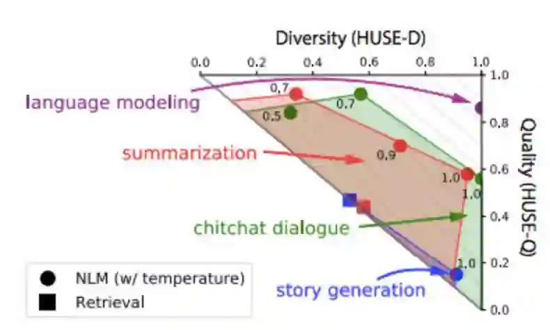 在摘要生成和聊天对话生成中,我们证明了 (1) HUSE 能够检测到纯粹人类评估无法发现的多样性缺陷,(2) 退火等技术在提升质量的同时降低了 HUSE 值,即以降低多样性为代价。