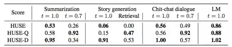 表 1:在文本摘要、故事生成、聊天对话系统和语言建模四种任务上最优模型的性能,评估指标为整体的拟合优度 (HUSE)、样本质量 (HUSE-Q) 和多样性 (HUSE-D)。HUSE 和 HUSE-Q 的范围是 0.0(完全可与参考文本区分开来)到 1.0(完全无法与参考文本区分开来),分类误差为 HUSE/2。当 HUSE-Q > HUSE 时,HUSE-D 的范围可能会超出 1.0,因为它的样本量较小。
