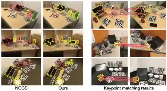 其中,前两列为NOCS和6-PACK的定性对比,后两列为关键点匹配的结果。