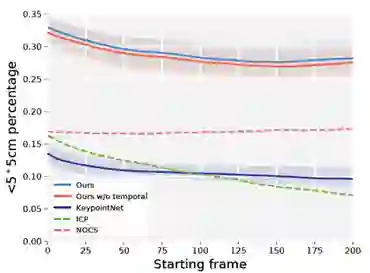 3)为了检验不同方法的鲁棒性和稳定性,作者计算了没有前x帧的平均性能。这样就能测量出初始位姿对性能的影响(接近初始位姿的帧很容易跟踪)。如下图,除了NOCS之外,所有方法的性能都有所下降,因为NOCS是位姿估计方法,而不是位姿跟踪方法。在整个过程中,6-PACK的性能比NOCS高出10%以上,并在初始帧100后停止下降。
