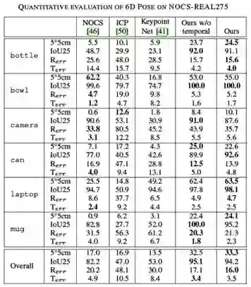 作者采用的数据集是NOCS-REAL275,包含六个类别。通过对比三个模型的baseline来评估作者的方法。