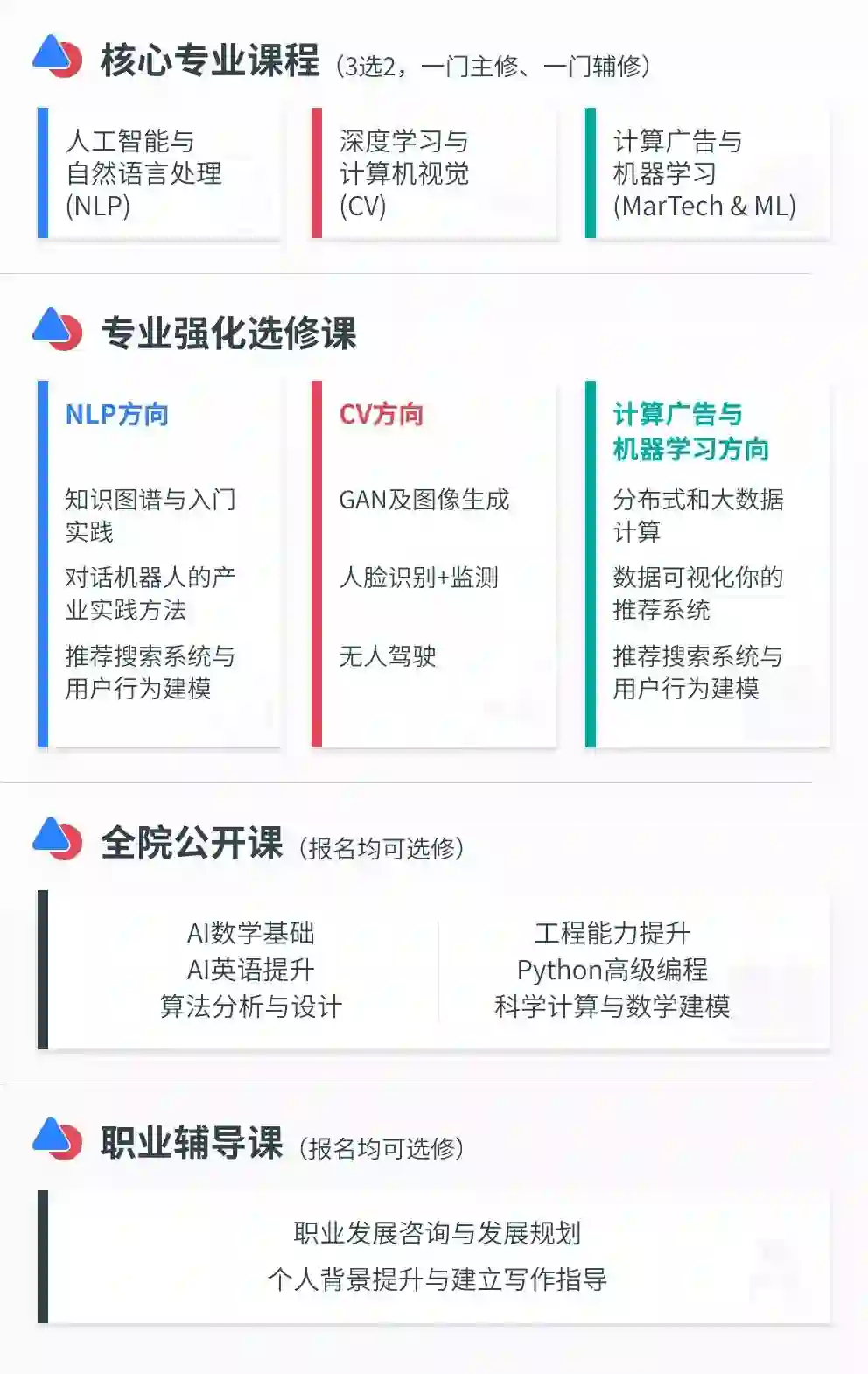 为满足不同基础学员需求,更有丰富的人工智能专业选修课及全院公开课帮助学员全面提升。