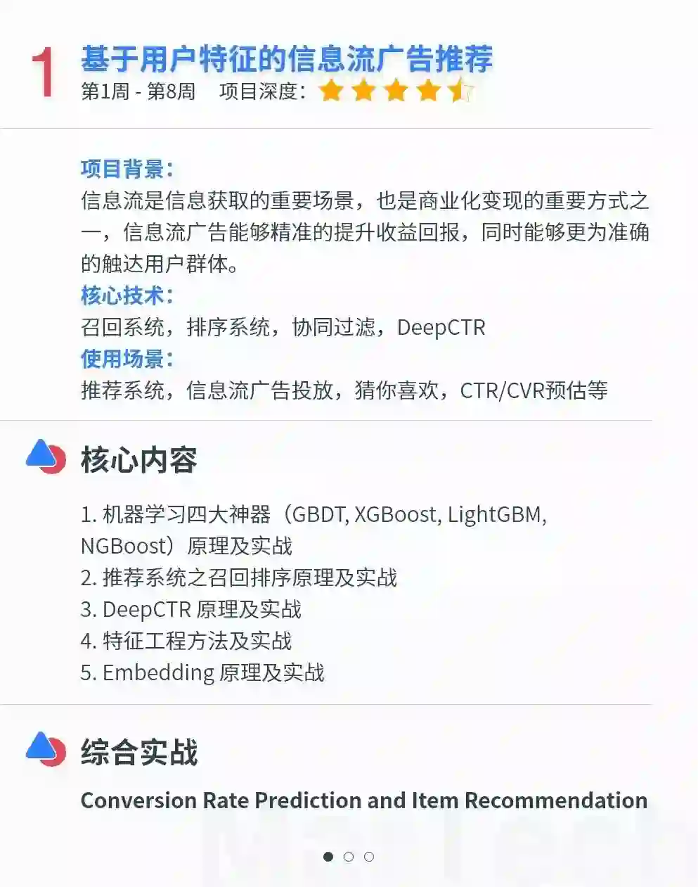 百度飞桨与后厂理工学院精选NLP/CV/计算广告与机器学习3大方向9大AI前沿工程项目,并提供脱敏数据集供学员实战使用,旨在培养具有核心竞争力的AI工程师。