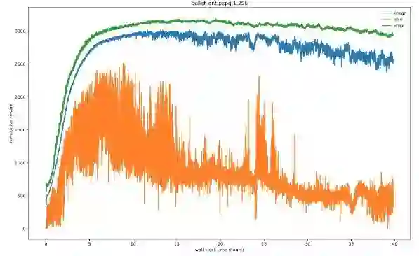 标准运动任务类似于 roboschool 中的运动任务,例如 Inverted Pendulum、Hopper、Walker、HalfCheetah、Ant 和 Humanoid 也可以在 pybullet 中使用。我发现了一个策略,在 pybullet 的蚂蚁任务中获得了 3000 分,我是使用 PEPG 在智能代理数为 256 的多核机器上花费几个小时完成训练的。