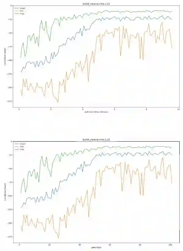 让我们首先尝试更简单的版本,赛车只需要学习一个跟踪巨型球移动的策略。在 RacecarBulletEnv-v0 环境中,智能代理获取球的相对坐标作为输入,并输出控制电机速度和转向方向的连续动作。该任务非常简单,在 2014 款 Macbook Pro(8 核 CPU)上只需要花费 5 分钟(50 次迭代)即可完成训练。使用 estool,下面的命令将启动一个含有 8 进程的训练程序,每个进程负责 4 项作业,这样总共就有 32 个工作器,然后使用 CMA-ES 来演进策略: