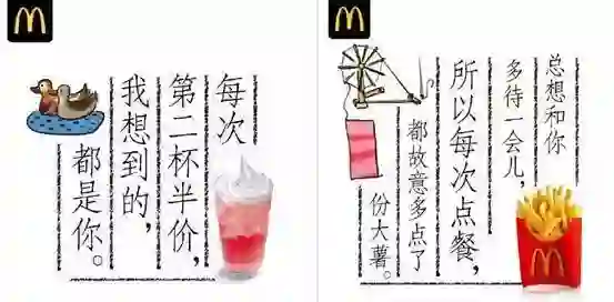 “每次第二杯半价,我想到的都是你”在人们购买麦当劳时经常遇到的场景中植入情感触发点,而“每次点餐,都故意多点了份大薯”,具象化的细节让人好像看到坐在餐厅里欲说还休的小情侣模样。