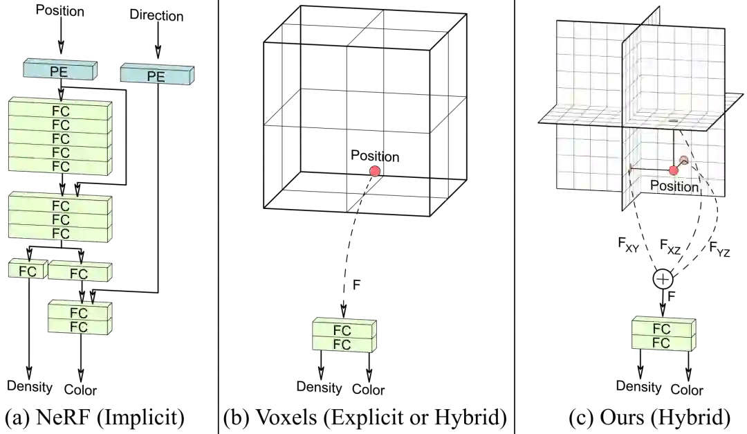 如上图a所示,神经隐性表征(NeRF)使用带有位置编码(PE)的全连接层(FC)来表示一个场景,但其查询速度很慢。