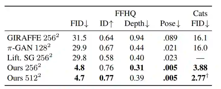 实验结果表明,论文提出的3D GAN在FFHQ和AFHQ Cats数据集上实现了SOTA的3D感知合成效果。