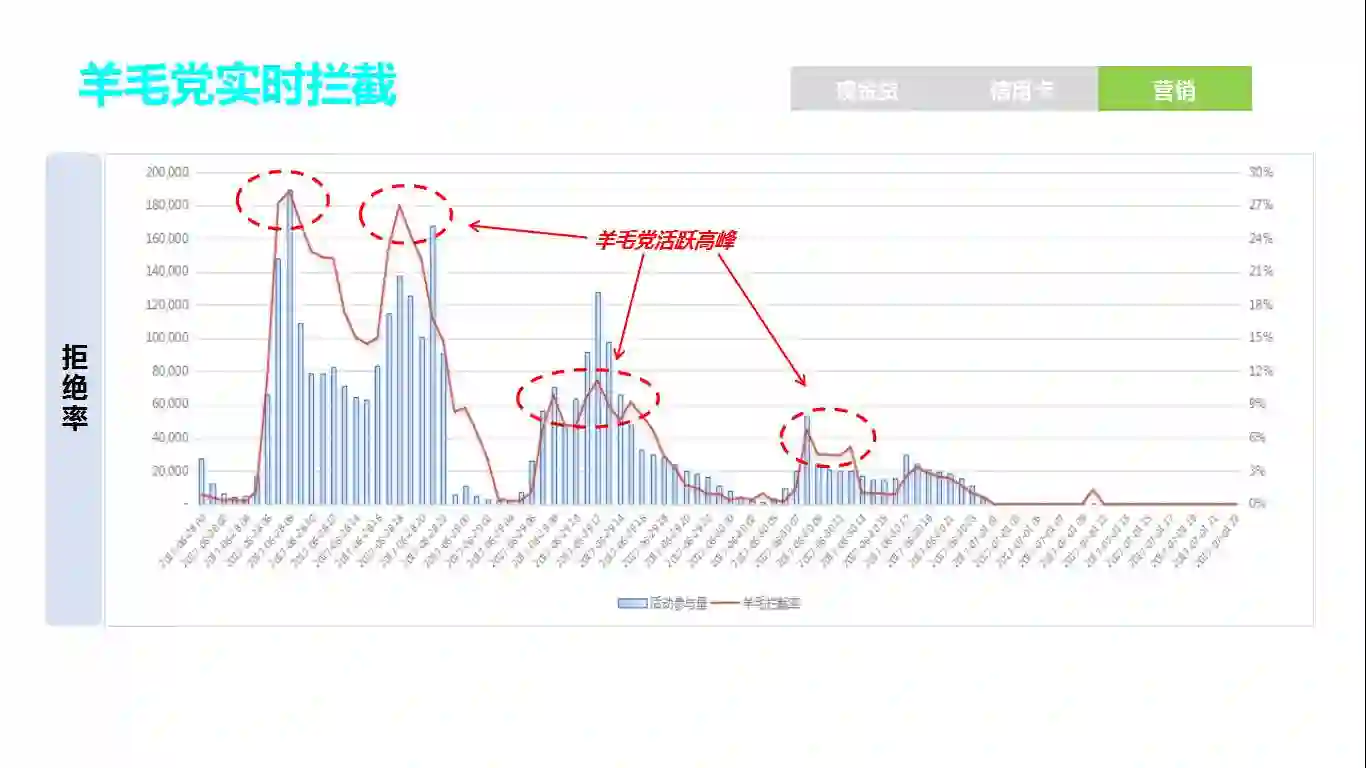 当公司大规模推营销活动时,会经历几个营销活动高峰,高峰也可能会伴随明显的羊毛党出没,针对机器批量点击、机器刷量、垃圾注册、推广薅羊毛等欺诈行为提供设备识别解决方案,众安反欺诈产品可以在活动高峰中精准识别机器设备的羊毛党,及时调整策略,让羊毛党无利可图。
