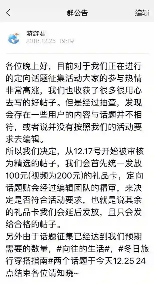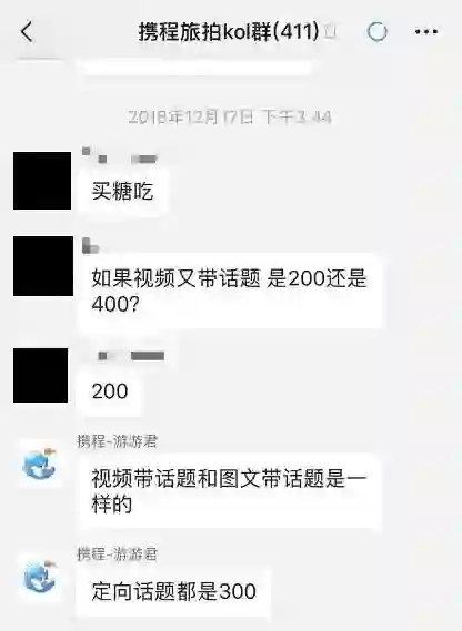 具体细节为2018年11月28日,旅拍就拉了两个四百多人的KOL群,12月17日旅拍开始推话题,带标签特定话题旅拍,300一条。随后,在所有人已经发布了一系列话题下内容的时候,突然在12月25日告知,12月17日之后的话题精选贴由统一300变成100-200元,期间补贴的差价需要再度审核才会发放。同时宣布:因为话题旅拍已经达到了预期数量,活动在当晚提前结束。而至于剩下的200什么时候发,则没有告知明确的时间节点。
