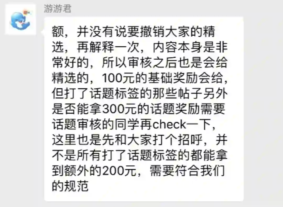 最早一位叫虾饺的旅拍达人在公众号上发文指出,旅拍已经加精的内容需要二次审核,补贴由300变为先发放100元基础奖励,缩水三分之二,以及随意更改活动截止日期,直接通知活动提前结束,没有履约精神。